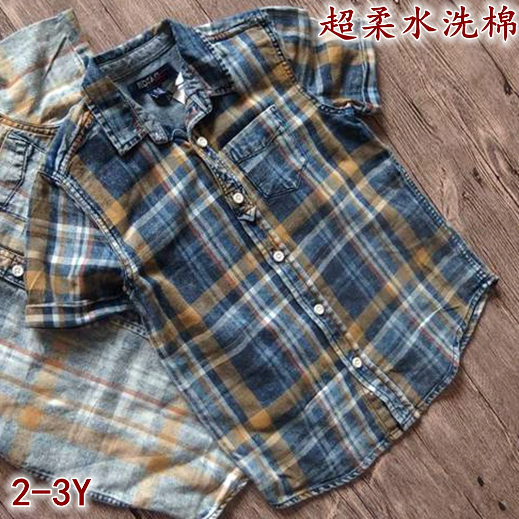 断码特价男童小童夏款超柔薄款洗纯棉短袖格子翻领T恤衬衫原单