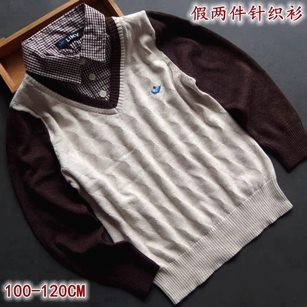 出口韩国外贸原单男童小中童春秋假两件长袖翻领针织纯棉线衫毛衣